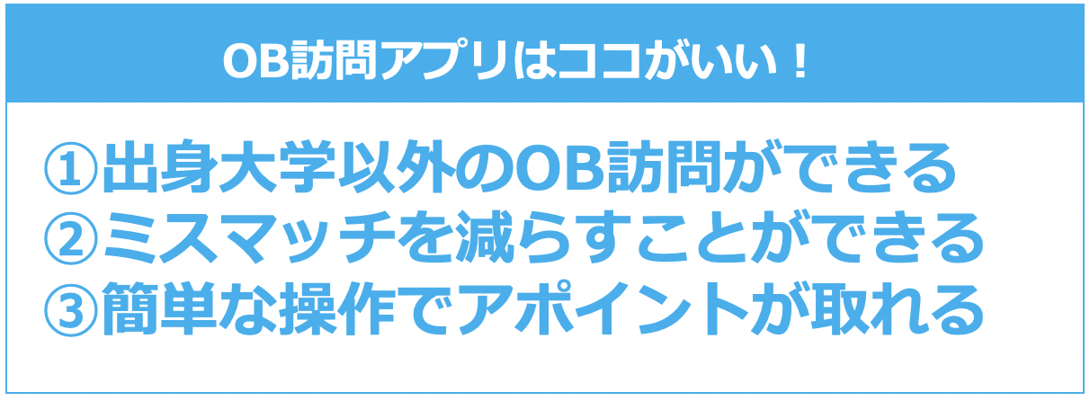 ※本記事では、便宜上、OB・OGをまとめてOBと呼称しております。まず、OB訪問をする上でアプリやサービスを利用するメリットについて簡単にご説明させていただきます。