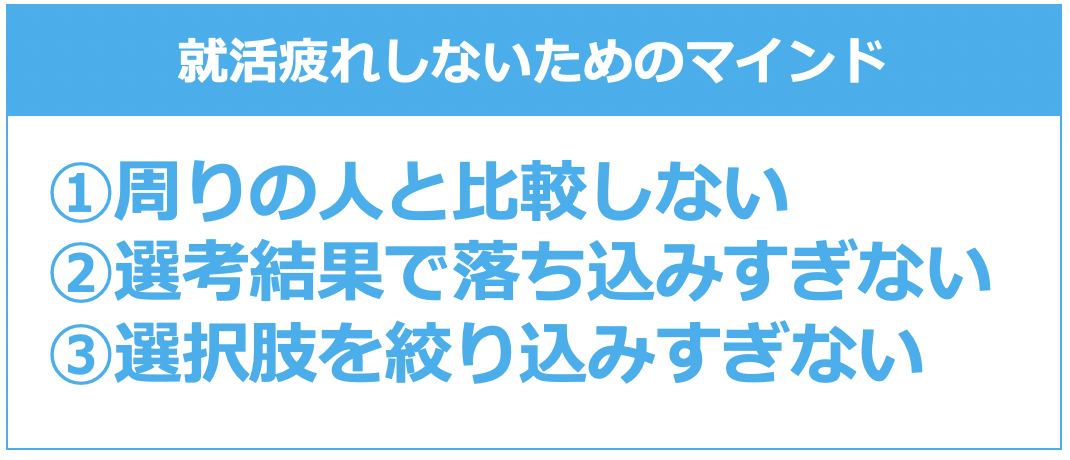 というわけで、ここからは実際に私が就活しながら意識していた「就活疲れしないためのマインド」を