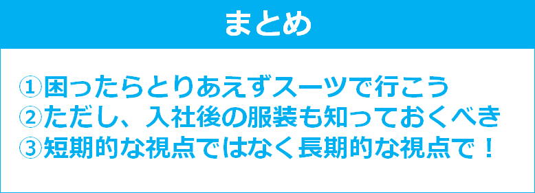 入社後はスーツが必須という事実を知らず、「就活の時だけスーツ着て行けばいいんでしょ?」という短期的な考えは危険です。仮に選考が上手くいったとしても、入社してから自分が苦しむことになるので、長期的な視点で服装について調査しておきましょう。
