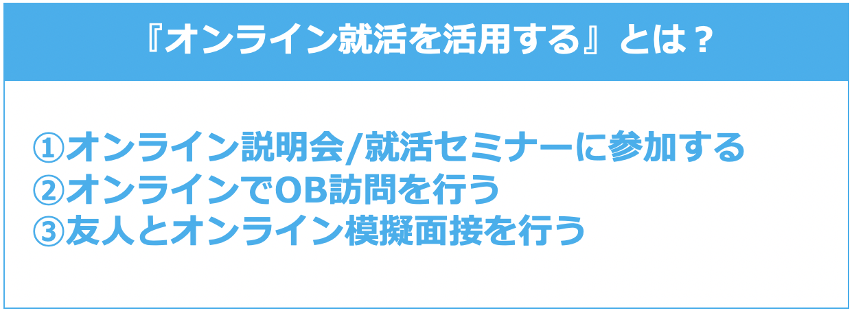 このような状況の中で、就活生は何をすべきか。それは『オンライン就活を活用すること』です。