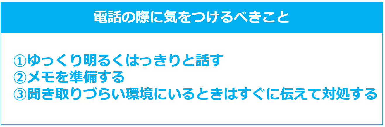 電話をかける側であるときも電話に出る側であるときも、ゆっくり明るくはっきりと話すこと、メモを準備すること、聞き取りづらい環境にいる場合はすぐに伝えて対処することの3点は常に気を付けましょう。