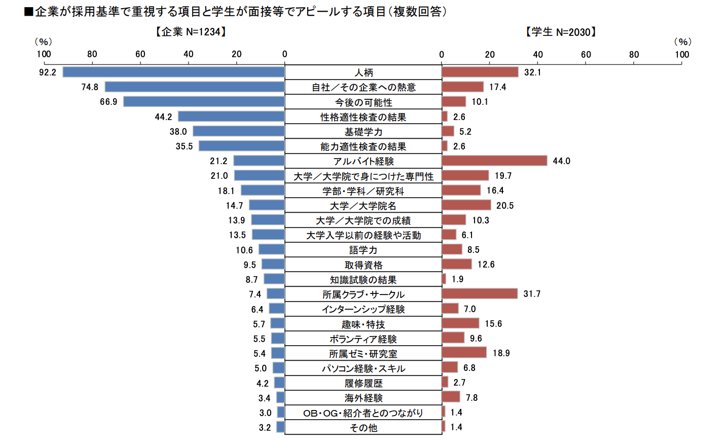 また、下記の画像左側の青グラフ、こちらは『企業が採用基準で重視する項目』を示しています。