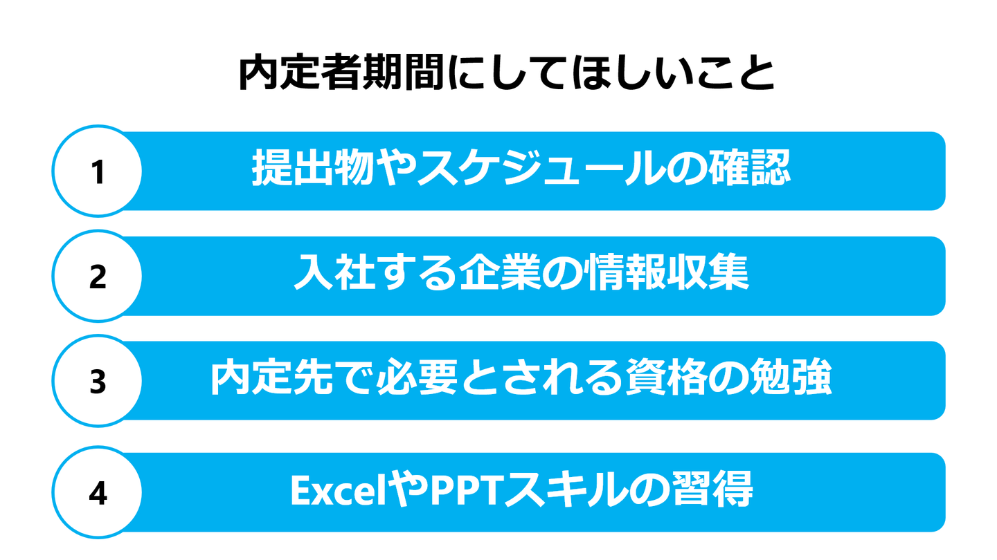 内定者期間にしてほしいことは、主にこの4つです。