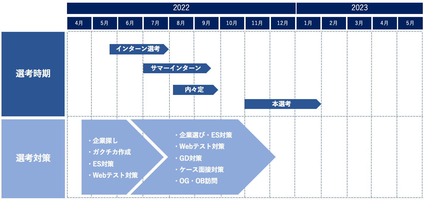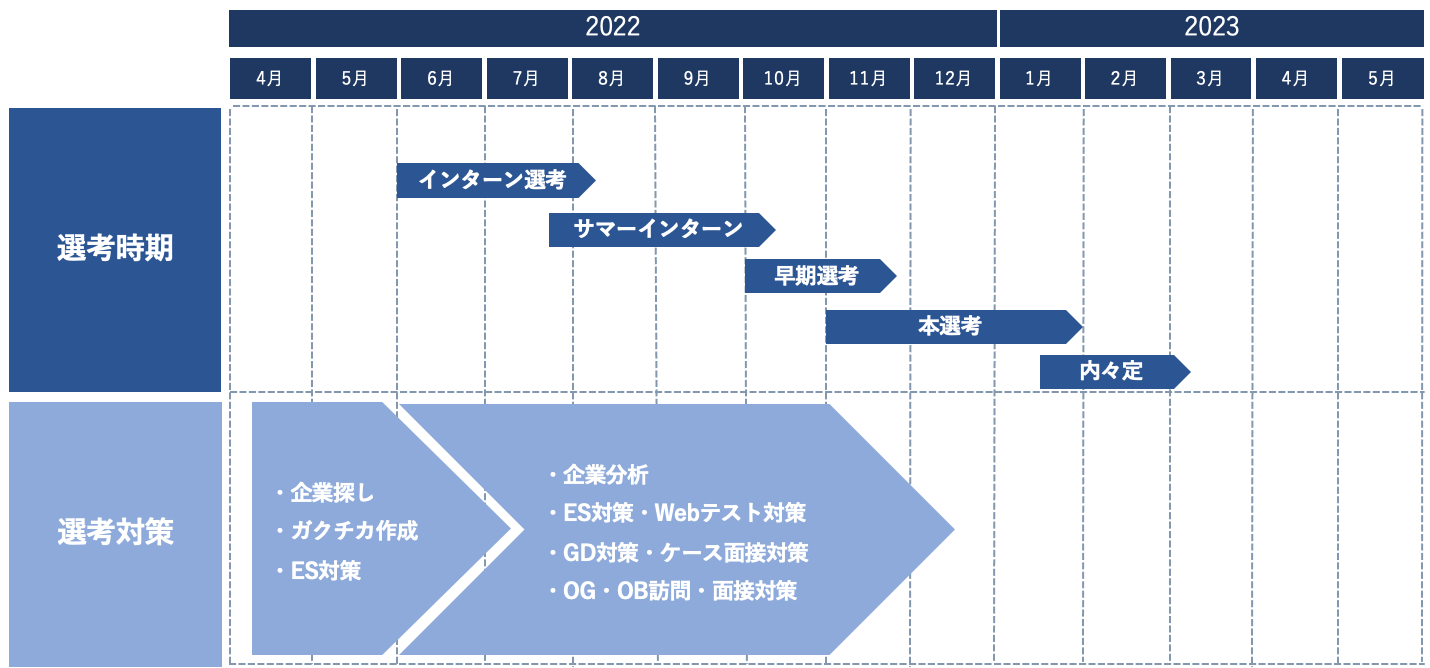 6月になるとインターン選考が本格化し、他の選考対策に時間を取られてしまうため、4~5月の早期からの対策をおすすめします。