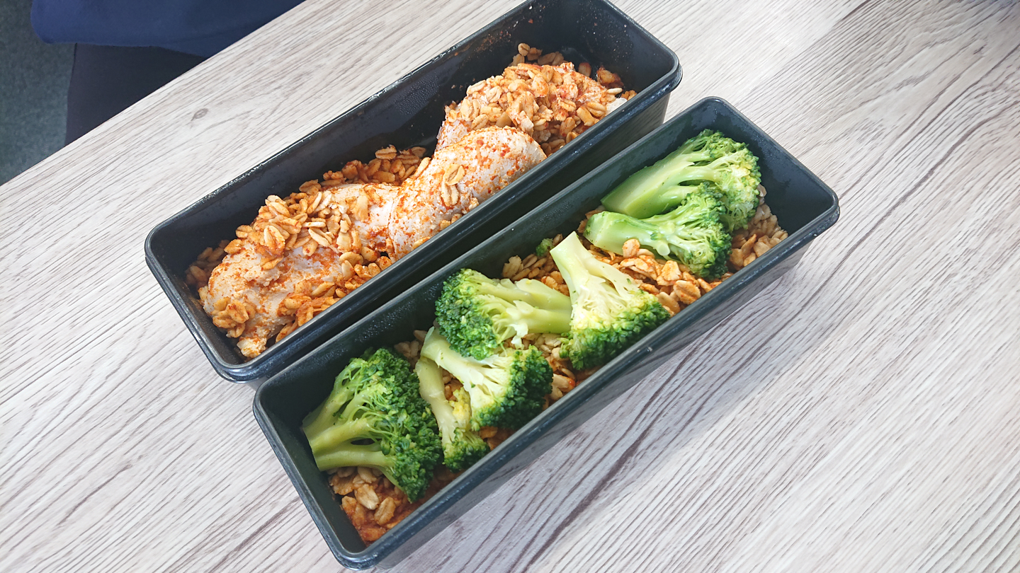 写真は、筋トレ女子のお弁当です。ささみとブロッコリーとオートミールで作った、