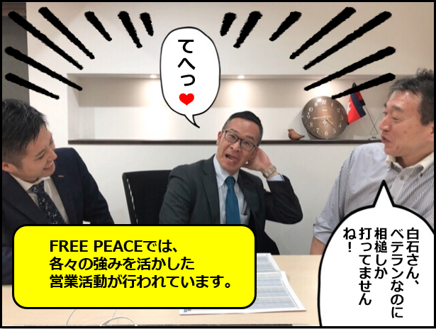 ゼンシングループの中の株式会社FREE PEACEでは、不動産、保険、投資分野など様々な専門分野をもったプロフェッショナルが集まっています。よりお客さまのお役に立てるよう、社内では各々の強みを活かして、協力し合う活動が行われています。