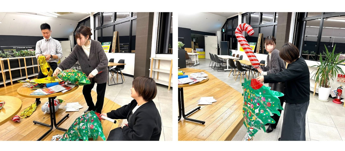 今回のクリスマスパーティーは、広告制作や社内外のイベント運営を手がけるプロモーション事業部が主催しました!他部署のメンバーにも協力してもらい、プレゼントを並べたり、風船を膨らませたりと、和気あいあいとした雰囲気の中で準備を進めていきます。