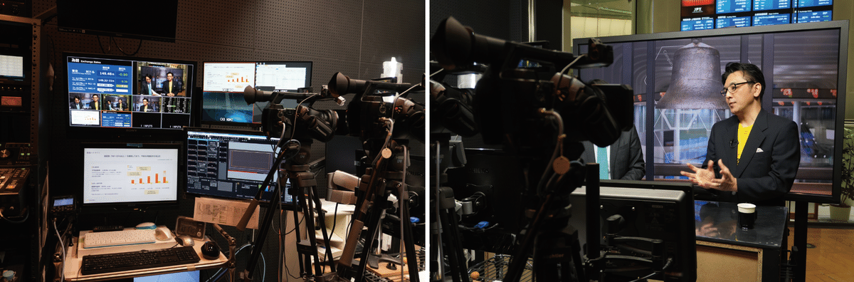 セレモニーの直前、生放送番組「Stock Voice」の撮影に挑むため、代表の仲里とIRチームメンバーが、一足先に東証に到着しました。