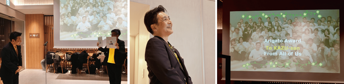 ジグザグのメンバーからの特別な「ARIGATO AWARD」として、代表のKAZUさんへメッセージを贈りました。