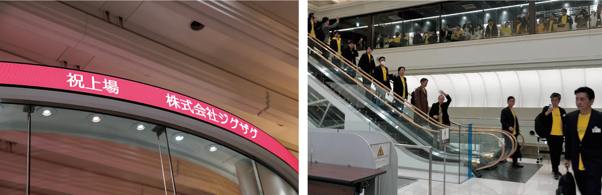 電光掲示板に「祝上場 株式会社ジグザグ」の文字が表示され、東証スタッフの皆さまの温かいお出迎えとともに、15名のセレモニー参加者が入場しました。