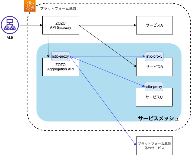 ZOZO Aggregation APIと通信先サービスが部分的にサービスメッシュ化された状態を下図に示します。