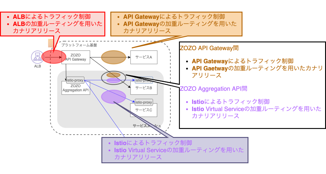 この状況の解消に向け、プラットフォーム基盤全体へサービスメッシュを拡大し、Istioによる一貫したトラフィック制御・カナリアリリース実装の展開を進めました。