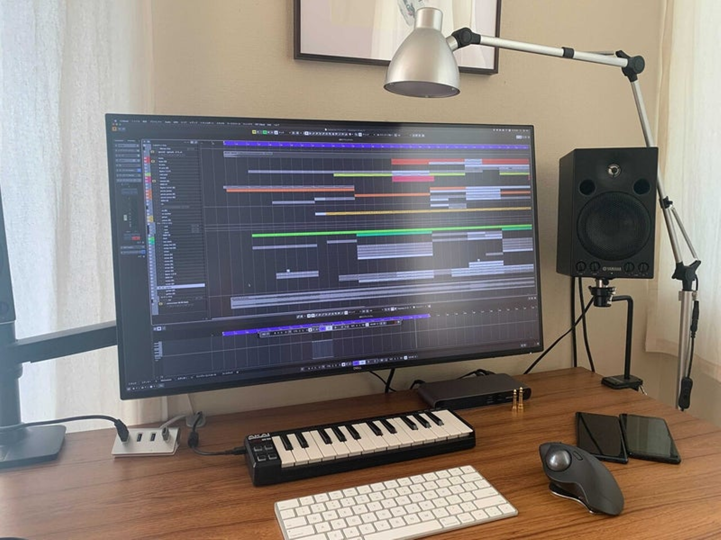 (自宅のデスク。学生の頃から音楽や絵画など、アートに広く関心があった高橋。正面にはお気に入りのアート作品を飾り、休日はエレクロトニカというジャンルの楽曲制作に没頭することも。)