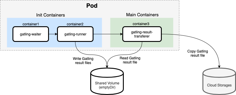 上図のようにGatling Runner Podはマルチコンテナーで構成されています。gatling-runnerによるGatling負荷試験の実行以外に、gatling-waiterとgatling-result-transfererでそれぞれ次のような前処理と後処理が実行されます。