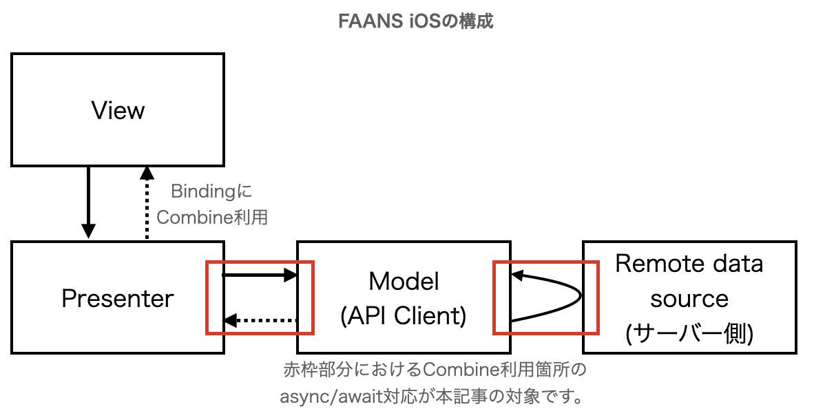 FAANS iOSでは非同期処理にCombineを利用しています。Combine自体は本記事では詳しく解説をしませんが、RxSwiftを利用したことがある方なら特に違和感なく使えるかと思います。全く馴染みがない場合だと覚えることも多く、難しいところもあるかと思いますので、Swift Concurrencyを利用する方が理解しやすいかもしれません。ただし、ViewとPresenterの値のバインディング処理にも利用していますので、FAANS iOSでは当面、Combineも利用していくと思われます。