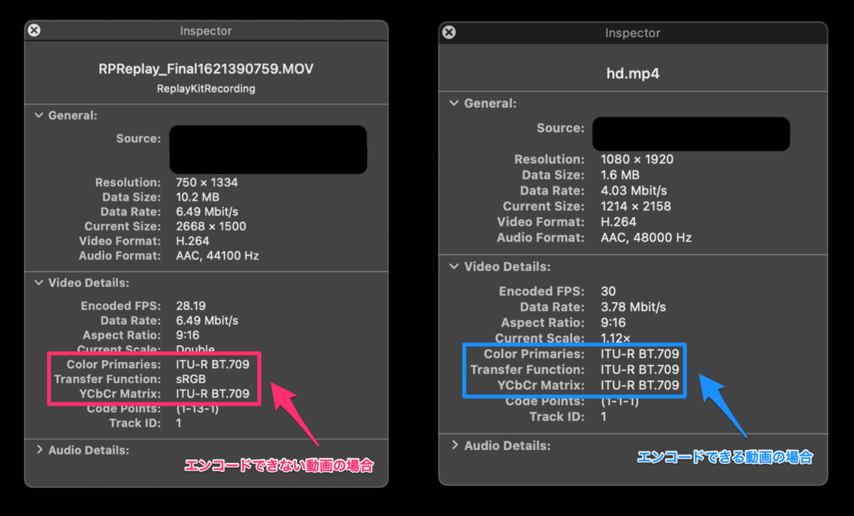 すると、エンコードできる動画と比べ、画面収録で撮った動画はTransfer FunctionがsRGBとなっており、Appleの Setting Color Properties for a Specific Resolution に記述されている設定例に無い値になっていました。