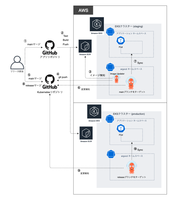 それでは、本記事のメインとなるArgo CD導入後の本番リリースフローについて説明します。