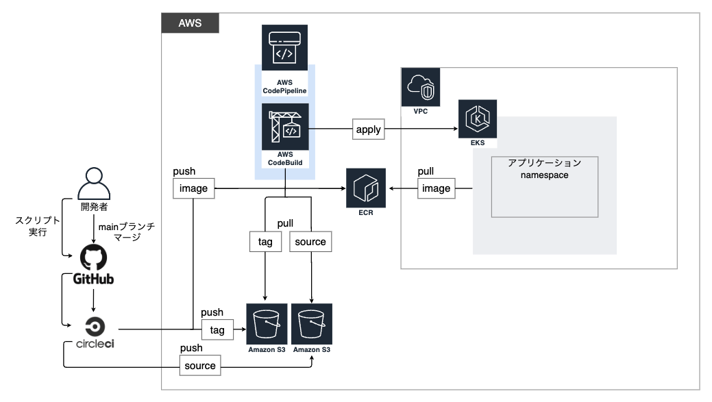- CodeBuildがソースとイメージタグファイルをS3から取得し、Skaffoldを使ってapplyする