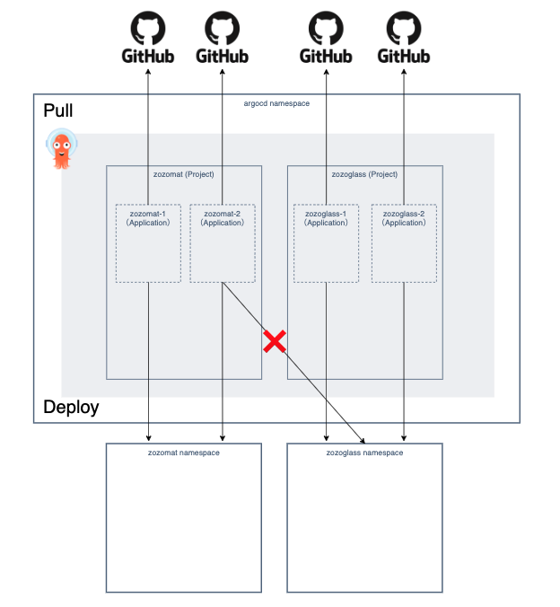 例えば、ZOZOMATをzozomat namespace、ZOZOGLASSをzozoglass namespaceで管理している場合、ZOZOMATのApplicationからzozoglass namespaceにデプロイできる状態になってしまいます。