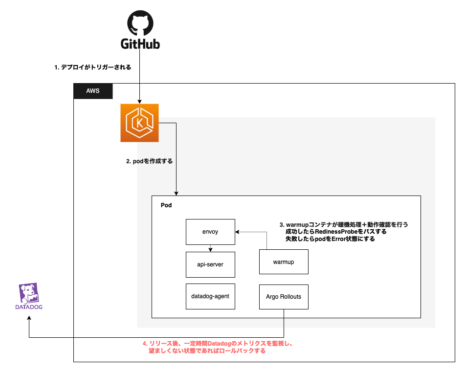 私達のチームではArgoCDを導入しており、KubernetesリソースをGitHubで管理しています。このため、ロールバックは、アプリケーションのイメージタグを変更するリリースPRをリバートすることで完了します。しかしながら、旧バージョンのPodが起動し、トラフィックが流れるまでの間、ユーザー影響は避けられません。