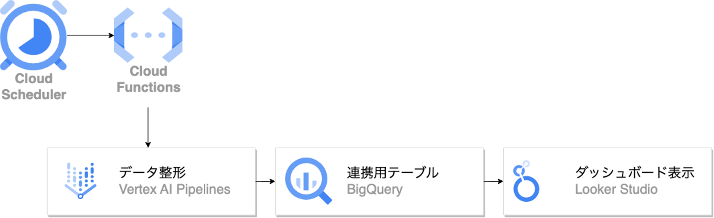 Vertex AI PipelinesはCloud SchedulerとCloud Functionsによって1日1回定期実行されます。Vertex AI PipelinesではBigQueryのジョブを実行し、Looker Studioのダッシュボードに表示しやすい形式でデータを整形してその結果を連携用のテーブルとして保存します。Looker Studioではこの中間テーブルからデータを取得してダッシュボードを表示しています。また、週に1度、指標の変化率を以下の様にSlackで通知していました。