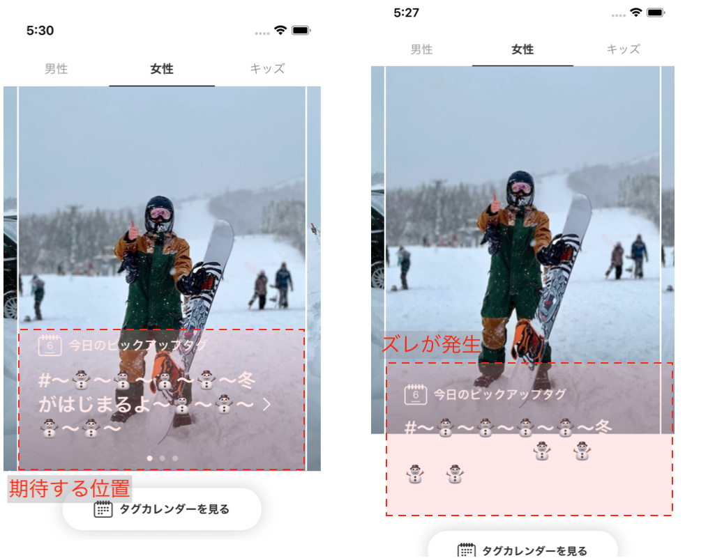 これによりCollectionViewの垂直方向が、少しでもスクロールされた状況下の場合に、事象が発生してしまいました。