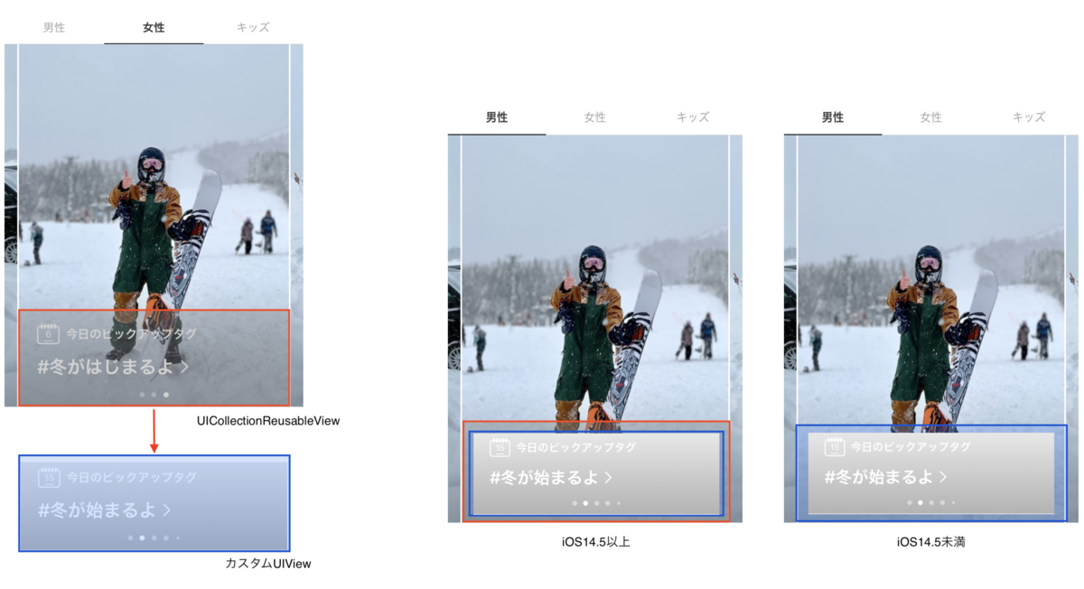 今回は後にターゲットOSを上げる予定があった為、暫定対応としてUICollectionReusableViewに直接実装したコンテンツをカスタムUIViewとして切り出しました。