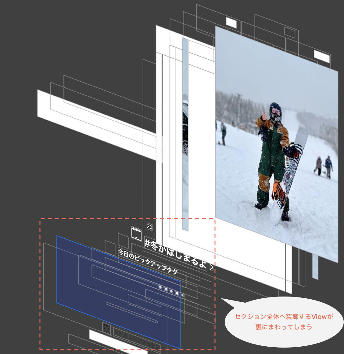 最初に直面した問題が、セクション全体に対するViewの装飾です。今回画像の赤枠部分について、次のように改修が必要になりました。