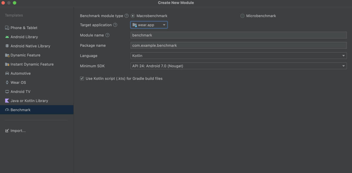 まずAndroid Studioの"Create New Module" でベンチマーク用のモジュールを追加するテンプレートが用意されているのでモジュールを追加します。