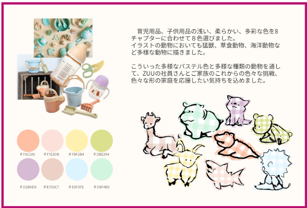 Kさん「動物園のような多様性のある企業にしたいというZUUの社名の由来に着想を得て、動物たちをモチーフにすることにしました。動物の種類、カラーバリエーションの幅をもたせ、多様性を表現しています。ZUUのコーポレートサイトは白黒赤のスタイリッシュな印象ですが、産休育休ガイドブックは、利用する人に安心感を持たせたいという思いから、パステルカラーを使用しています。赤ちゃんのおもちゃを思わせる、パステルカラー、丸っとしたデザインを意識してデザインしました。」
