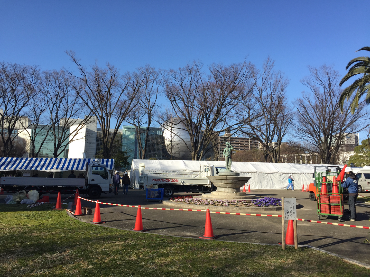 移動の途中の公園らしき広場で、なにやら大掛かりなイベントの準備が行われていました。