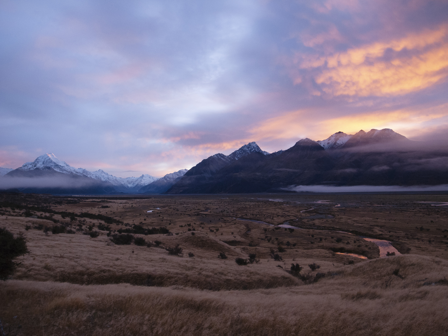空港に向かっている帰路、マウント・クック国立公園の朝焼け