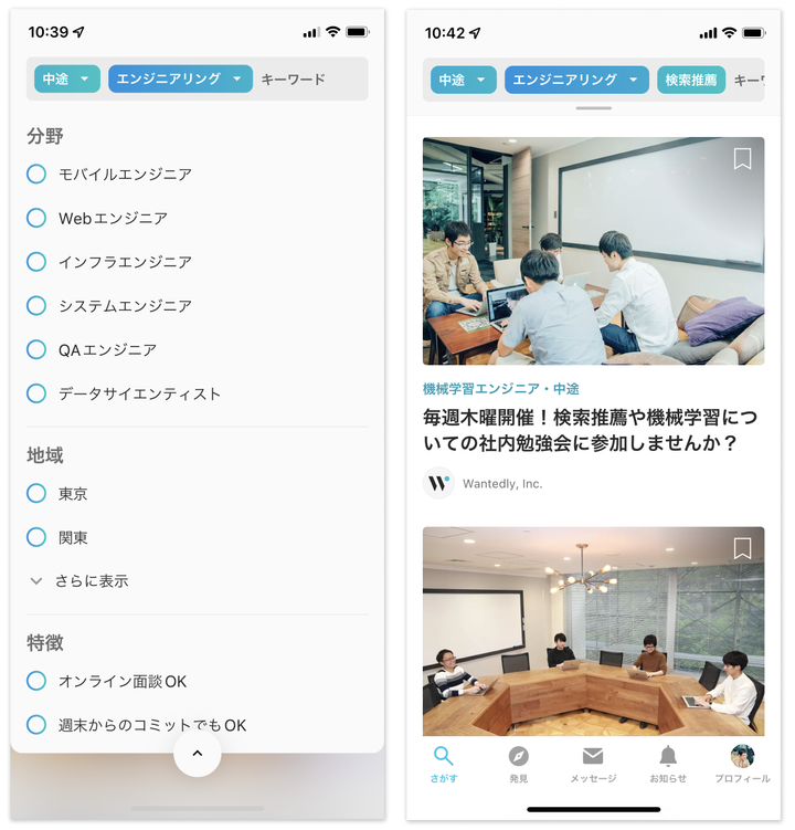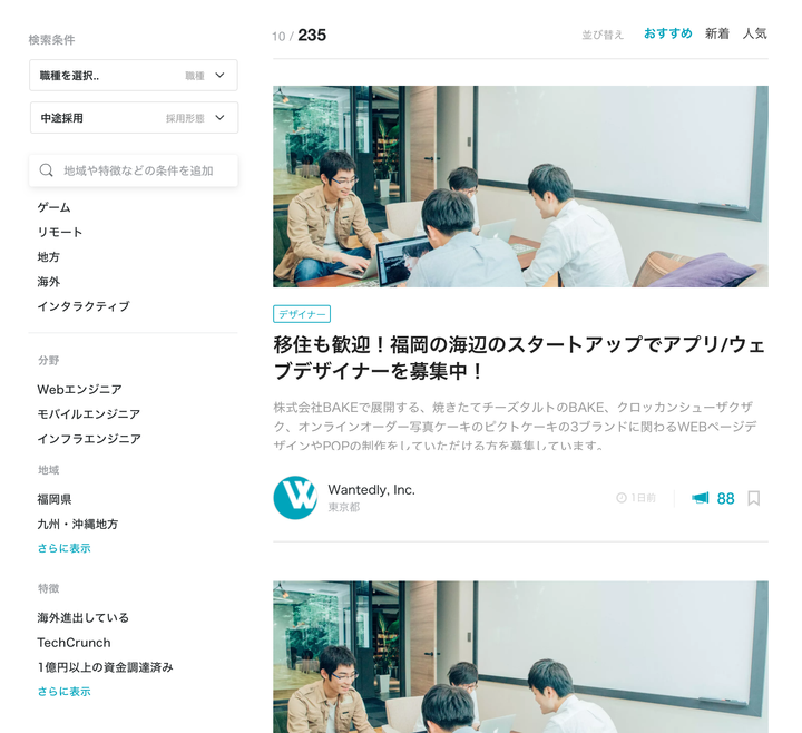 wantedly.com のトップページにあたる募集を探す機能をリニューアルしました。 この変更では UI のリニューアルと共に、それまでなかった全文検索機能の追加を行なっています。進める上では、地域・職種等の明確な項目による絞り込みと、キーワードによるファジーさを内包した検索をどのように同居させるかに注意を払いました。 全体的には、オートコンプリートに出すアルゴリズムや「さらに表示」による UI 上のコントラスト等を上手く活用して、ユーザーが最も良い体験を得られるであろうクエリを提示することを志向しています。 A/Bテストを実施した結果、初動の数字で応募数が10%、応募率が20%程度改善したので導入、同様のコンセプトがモバイルアプリにも展開されました。