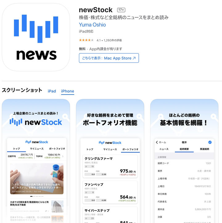 企業(銘柄)ごとのニュースを読めるアプリです。 ■ 気になる銘柄のニュースを一気にまとめ読み! ■ 「ポートフォリオ」機能搭載!好きな銘柄を登録して、ニュースをまとめ読みできる! ■ ユーザーに人気の銘柄やニュースがわかるので、トレンドを掴める! ■ 上場したばかりの銘柄や、上場直近の銘柄の情報(IPO)も随時更新中! ■ ニュースのコメント機能で、ユーザー同士の交流や自分用メモなど用途多彩! ▼ 利用可能なプラン 1. 無料プラン 無料で基本的な機能が使えます。 ポートフォリオは無料ユーザーでも100件まで登録できますが、ポートフォリオ一覧から情報を閲覧できるのは5件までとなります。また、登録中のポートフォリオのニュースを一気読みできるマイニュースも、これらの5件分の銘柄のニュースに制限されます。 2. プレミアム(1ヶ月) 1ヶ月あたり450円で、ポートフォリオの閲覧制限がなくなります(登録制限はプレミアムでも100件)。また、ポートフォリオに登録しているすべての銘柄のニュースをマイニュースで一気読みできます。 また、プレミアムを初めて購入されると、1ヶ月間の無料期間をプレゼントいたします。 ※注意 ・プレミアムは1ヶ月ごとに自動で更新されます。 ・お支払いは Apple ID アカウントに請求されます。 ・有効期限が切れる24時間前にキャンセルしない限り、自動的に更新されます。 ・無料期間は初めて購入する場合のみ適用されます ・いつでも手数料なしでキャンセル可能です ・アプリをアンインストールするだけではプレミアムの自動更新はキャンセルされませんのでご注意ください ・プレミアムを解約する場合は、iOS の「設定アプリ -> 最上部の Apple ID 部分 -> サブスクリプション」から解約処理を行えます。