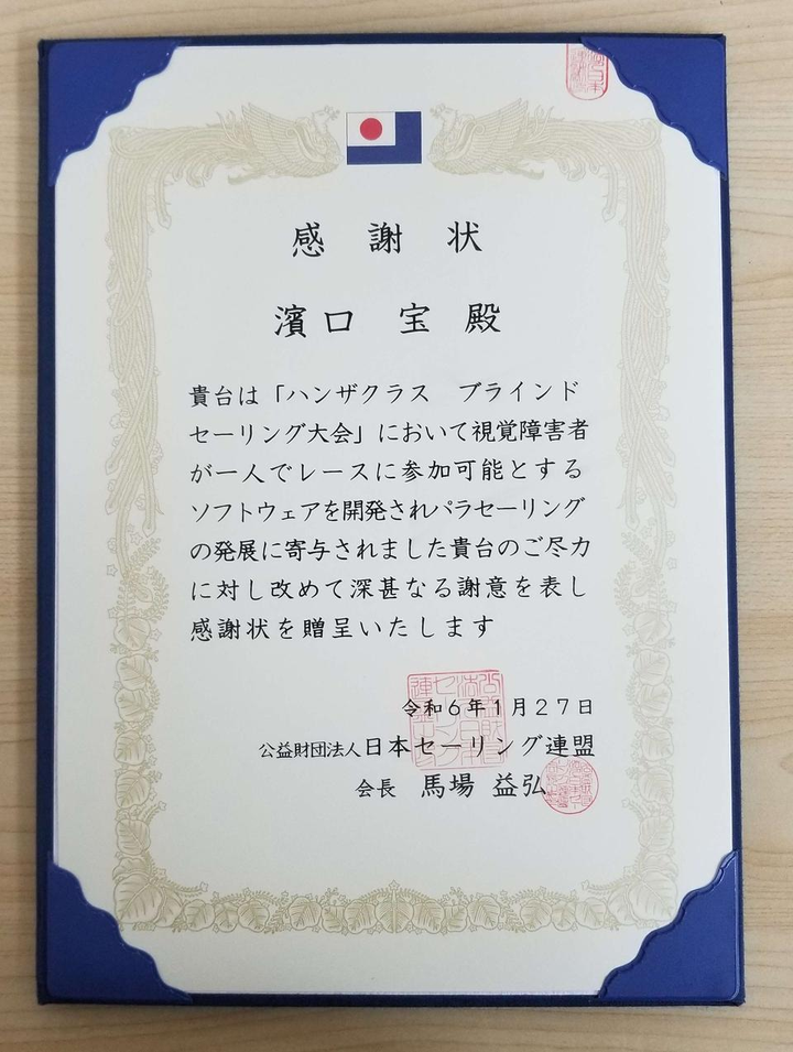 視覚障がい者セーリング支援アプリを開発したことに対して、公益財団法人日本セーリング連盟様から感謝状をいただきました。