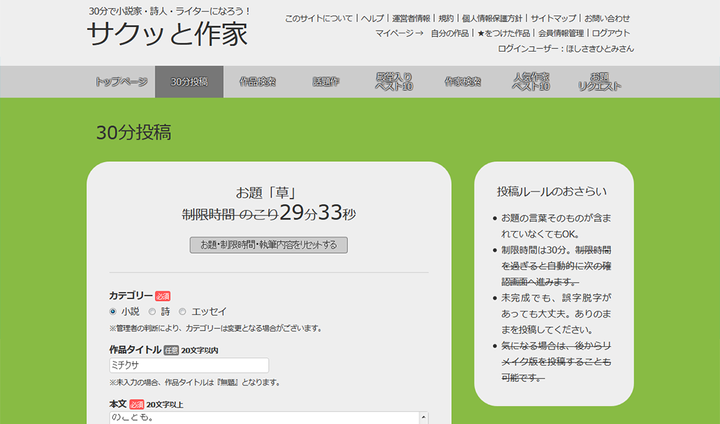 職業訓練の卒業個人制作サービス。イメージは「ボケて」の小説版。ランダムに出されるお題にそって、30分で小説を書いて投稿するサイトです。Javaで書きました。プレゼンの20分間の間に生徒からドンドン投稿されたので、使いやすさ・楽しさ共に成功だったと思います。ここまで作り込む生徒は過去にいなかったらしく、教師陣から絶賛されました。