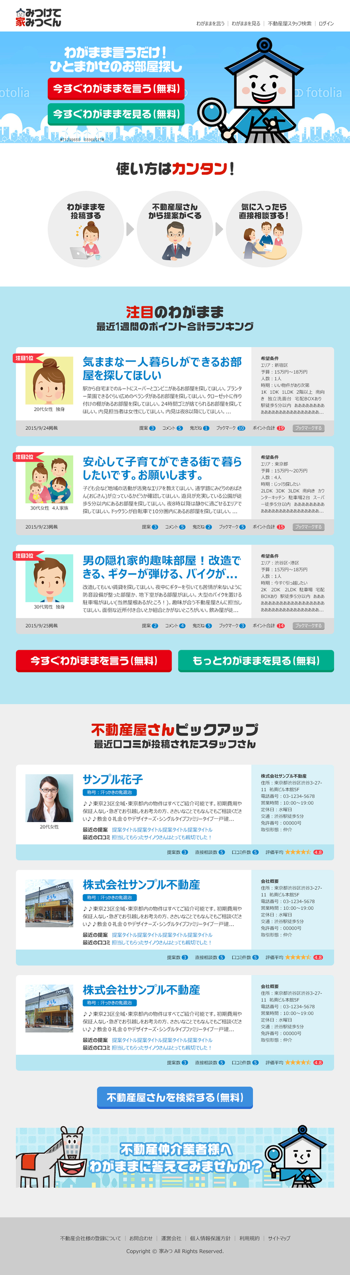 新規事業部に配属されて最初にカタチにしたアイデア。家探し中のユーザーが条件を登録し、不動産屋が提案を送るスタイルです。企画、遷移図作成、DB設計、LP作成、デザイン、コーディング、プログラミング、対面インタビュー、テレアポ、集客施策など、一通りを体験しました。