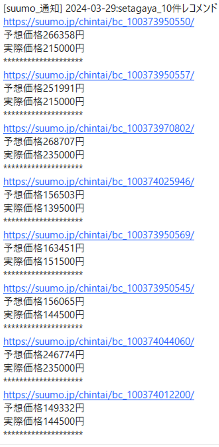 上記ワークフロー図の流れでデータ基盤とレコメンドシステムを構築した。 【EC2で実行する処理】 1. 新着物件の情報をSUUMOからスクレイピングする。 2. スクレピングしたデータをparquet化してs3へ送信する。 3. スクレピングしたデータを前処理する。 4. 前処理を施したデータを用いて賃料予測を実行する。 5. LINE Notifyを使って自分のアカウントに、モデルの予測賃料よりも低かったものを割安物件として通知する。 【外部データ】 - 公示価格 - 駅別乗降客数データ 【モデルの構築方法】 - cat_boost - 使用した代表的な特徴量 - 建物種別 - 地価公示 - 築年数 - stories_high - floor - 総戸数 - bed_rooms - L - S - DK - K - 専有面積 - 向き - 構造 - コンビニの数 - スーパーの数 - min_コンビニ_距離 - max_コンビニ_距離 - min_スーパー_距離 - max_スーパー_距離 - station_walk - 乗客数 - distance_from_shinjyuku - 予測対象 - 平米単価賃料