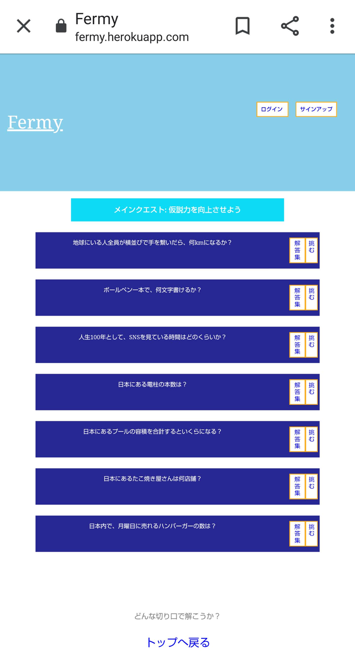 「仮説構築力」を鍛えることができる。 多くの仕事において、有効なスキルは仮説を立てる力である。 仮説とは、実際にその仕事に手を付ける前に、どうすれば最高の効率で遂行できるか、何が必要になるか、こうすればどんな結果を期待できるかを予想する力とも言える。 仮説構築力の向上には、フェルミー推定問題が良きトレーニング教材である。 しかし、インターネット上にはmフェルミー推定問題そのものを解説した記事は多くあるが、問題に挑む環境はさほど存在しない。 そこで、本アプリは、フェルミー推定問題を解くことを提供する。 詳細は、Git HubのFermyにてご確認下さい。 https://github.com/mitsuhiro-chikazawa/fermy