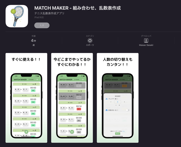趣味のテニスで使える、ダブルスの組み合わせをランダムで生成する乱数表のアプリを作成しました。 2コート12人まで対応することを目標に月一回のペースでアップデートを行なっています。