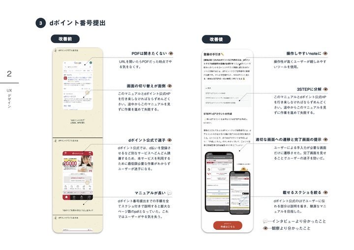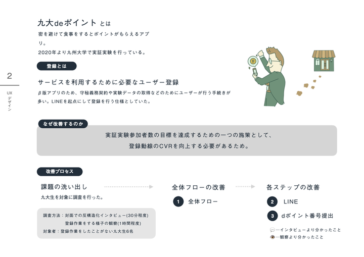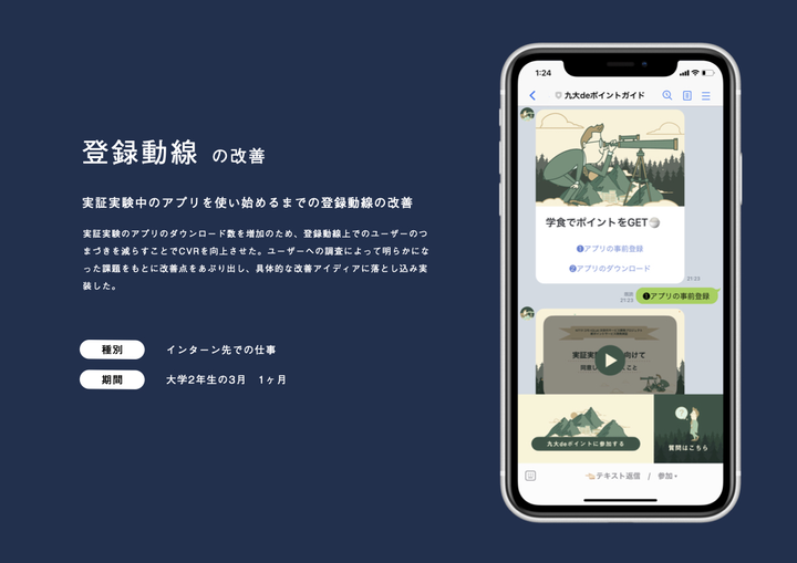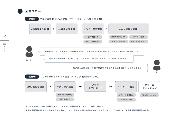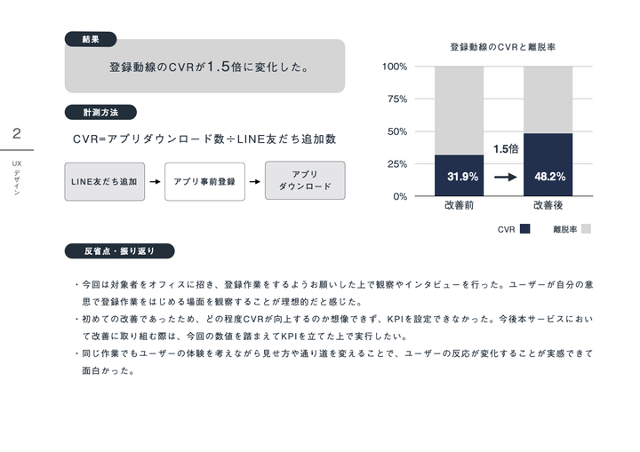 実証実験のアプリのダウンロード数増加のため、登録動線上でのユーザーのつまづきを減らすことでCVRを向上させた。ユーザーへの調査によって明らかになった課題をもとに改善点をあぶり出し、具体的な改善アイディアに落とし込み実装した。