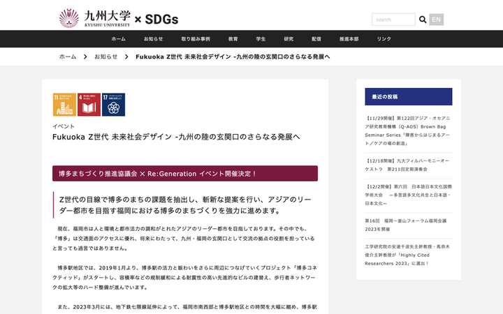 Re-Generation×博多まちづくり推進協議会で、博多駅周辺エリアのまちづくりについて再開発プロジェクト「博多コネクティッド」をテーマに未来創造WSを開催しました。 九州大学のHPにも掲載していただきました。