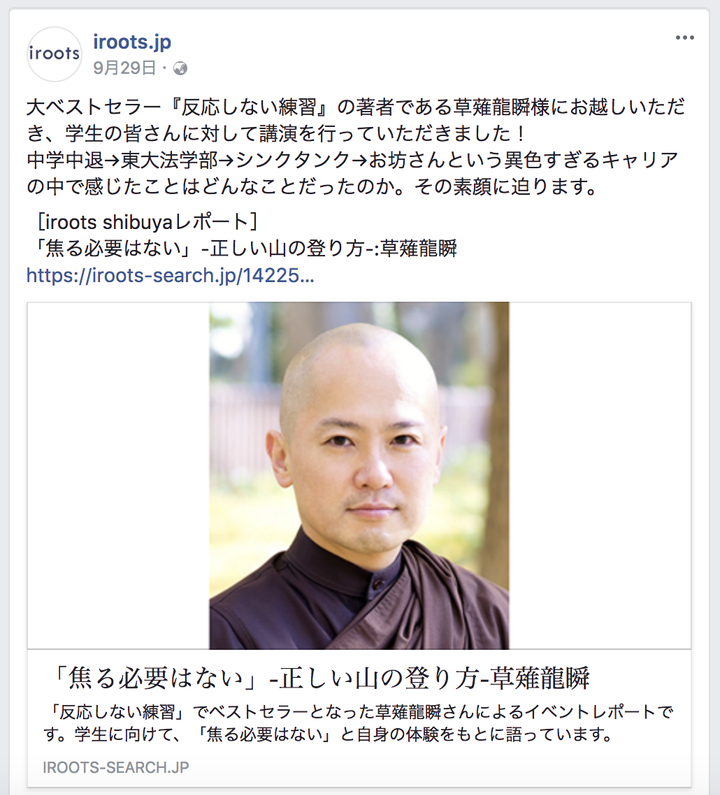 著書、「反応しない練習」がベストセラーとなった興道の里代表、 草薙龍瞬さんのイベントの様子を記事にさせていただきました。 進路に悩む学生に対して、何も知らない間に自分の人生を早々に 決めつけてしまうのではなく、まずは様々なことを 体験していくことが大切だと説かれています。