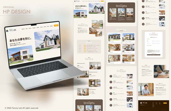 【建設会社コーポレートサイト】 建設会社のコーポレートサイト制作を担当しました。 ヒアリングをもとに、信頼感と分かりやすさを意識した構成設計(ワイヤーフレーム)からデザインまで一貫して対応しています。 ■ターゲット 自然素材の住まいに関心のある方(ファミリー層) ■課題 建設会社に対する「硬い・相談しづらい」印象により、 問い合わせへの心理的ハードルが高い ■工夫した点 ・ベージュ/ブラウンを基調に、自然素材のあたたかみを表現 ・写真トーンと余白設計を統一し、心地よさと信頼感を演出 ・施工事例やサービス内容を整理し、直感的に理解できる構成 ・初めてでも相談しやすい導線設計で、問い合わせへの不安を軽減