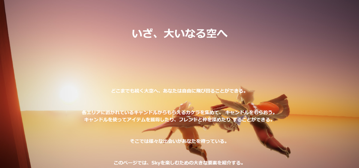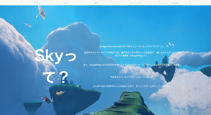 夏期課題でWebサイトを制作しました。テーマは「自分の好きなもの」で、私はモバイルゲームの「Sky~星を紡ぐ子どもたち~」の魅力をまとめたWebサイトにしました。