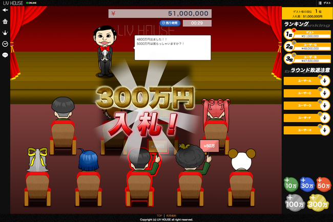ブラウザ上でリアルタイムに不動産のオークションが行えるサービスを設計・開発から運用まで行いました。チームメンバーは3名。 ゲーミフィケーションにも力を入れており、入札時の豪華な演出やアバターのアニメーションを工夫したり、運営側のMCがチャットや画面上の演出を配信する仕組みを導入したり、オークション終盤になると入札ごとにオークション時間が延長するサドンデスモードなどの機能を開発しました。 主な使用技術: - AWS (EC2, ELB, RDS など) - Node.js (+ Socket.IO) - Backbone.js
