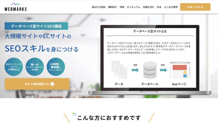データベース型サイトSEO講座のLPデザインを担当しました。ワイヤー構成から考え、レスポンシブデザインも担当しました。