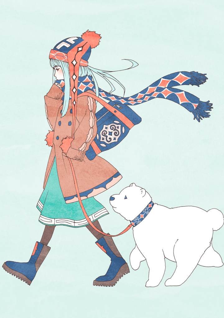 自主制作した絵です。アイヌ文様を現代の洋服に取り入れるとどのようになるのか実験的に描きました。使用したソフトはadobeのphotoshopです。