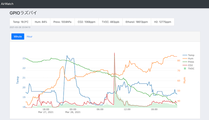 ラズベリーパイを使った自宅の空気品質モニターアプリ ・リビングの空気品質をモニター ・書斎の空気品質をモニター ・10分毎にセンサー値を取得し続けてDB保存 ・ラズパイを再起動してもアプリも自動起動 ・描画高速化のため限定数のデータでグラフ表示。非同期で残データ取得しシームレスにグラフを再描画 ・10分ごとにデータを再取得し、グラフをシームレスに更新し続ける。 ・1時間ごとのグラフもタブで表示 ・固定IP,VPN利用で、外出先からでもWebアプリ利用化(API通信におけるバックエンドのIPアドレスを簡易解決)