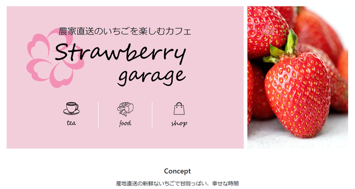 苺をメインにした架空カフェのランディングページを公開いたします。 ターゲットは「映え」が好きな20代の女性。 メニューエリアは、透け感のあるレイヤーのようにカーソルを合わせると色が変化するように設定 カラーを白とピンクで統一し、甘さと高級感をイメージしてもらえるようにデザインいたしました。